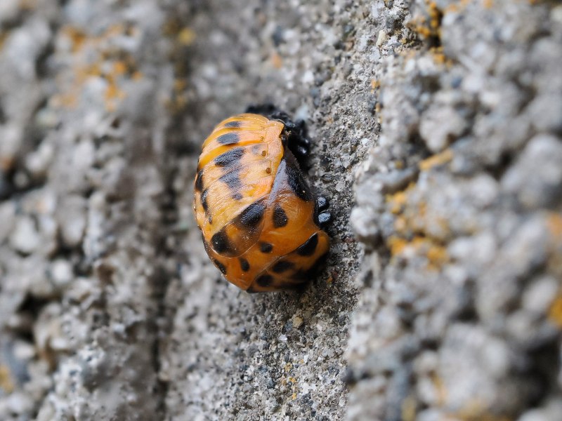 幼虫期間は2〜3週間で、この間に数百匹のアブラムシを捕食し、3回の脱皮を経て4齢幼虫になります。やがて十分に成長した幼虫は、日当たりのよい木の幹やコンクリート壁に体を固定して蛹になります。蛹は丸みをおびた形で、蛹化直後は鮮やかな黄色をしていますが、やがてオレンジ色に黒い斑点模様が浮かび上がり、日ごとに黒っぽくなっていきます。