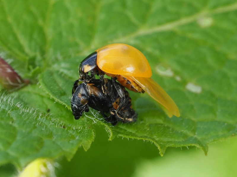 蛹化から1週間ほどたつと、蛹の背中や頭部が割れ、そこから成虫が現れます(羽化)。羽化直後の成虫の翅は黄色くて柔らかいのですが、次第に硬まって赤くなり、7つの黒点をもつ見慣れたナナホシテントウの姿になります。