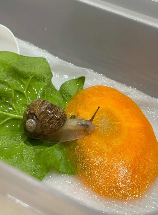 5ミリメートルくらいの小さなカタツムリ。にんじん食べるとオレンジのうんち、ほうれん草食べると緑のうんち、卵のカラもむしゃむしゃ食べるでんこちゃんです。