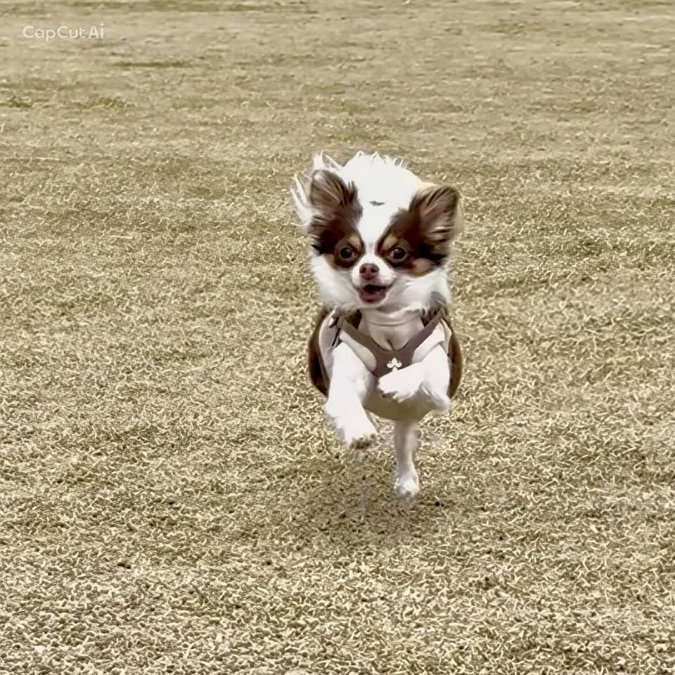 1.7キログラムの小さな体をいっぱい使って、ドッグランで楽しく遊んでいる様子です!