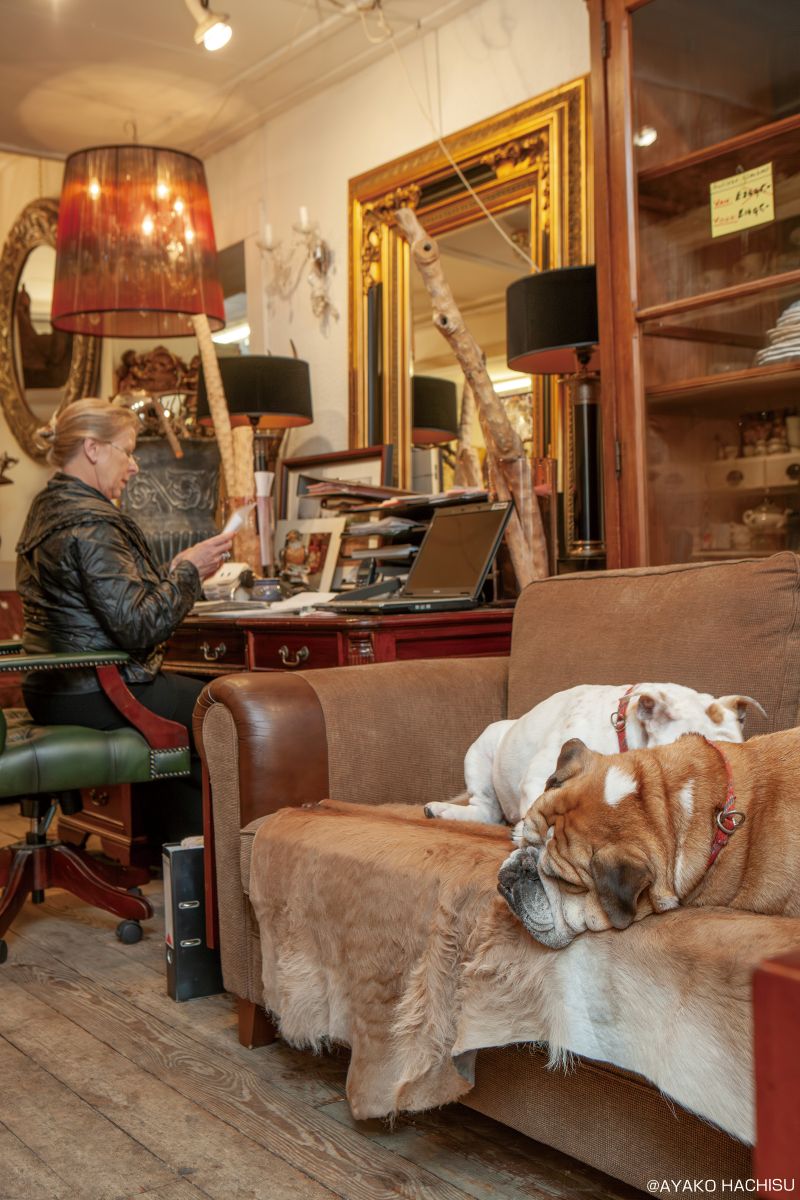 そんなかわいらしい街の中心を流れる川に沿って散策するうちに見つけた、水辺のカフェでお茶を楽しんでいると……、ふとブルドッグ愛にあふれたアンティークショップが目に留まりました。ショーウィンドウ越しに見えたのは、アンティークソファにどっしりと腰を掛けた、ピンクのニットを着た恰幅の良い男性。そしてその足元には、自由気ままにくつろぐ2頭のブルドッグ。あまりにも絵になる光景に、目が釘付けになりました。