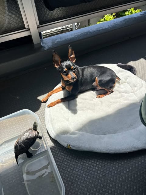 ミニチュアピンシャーのぴょん太と保護クサガメのぷく。