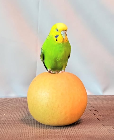 大きな梨と並んで背比べをしていたら、乗ってしまった……。